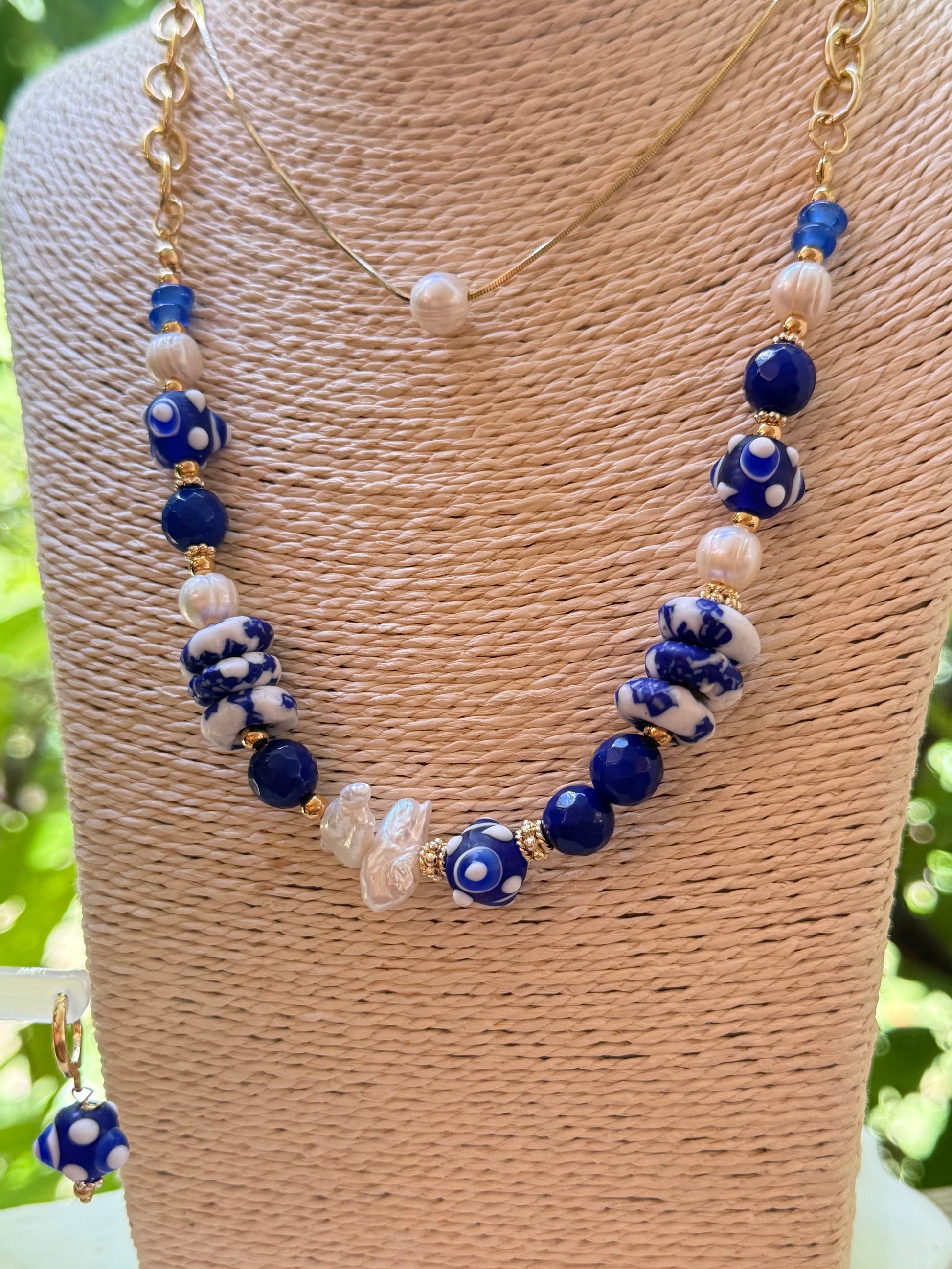 Hermoso collar hecho a mano en piedras africanas, cristal murano , perlas, jade, detalles en baño de oro laminado y cadena en aluminio. Collar mide 18”, puedes llevarlo más corto ya que la cadena es eslabón grande y lo permite. El collar de hilo con estrella de vidrio. En hilo azul es ajustable. Pulseras son ajustables. Se venden individuales y aretes en combinación estilo Huggies alambradas en cristales murano