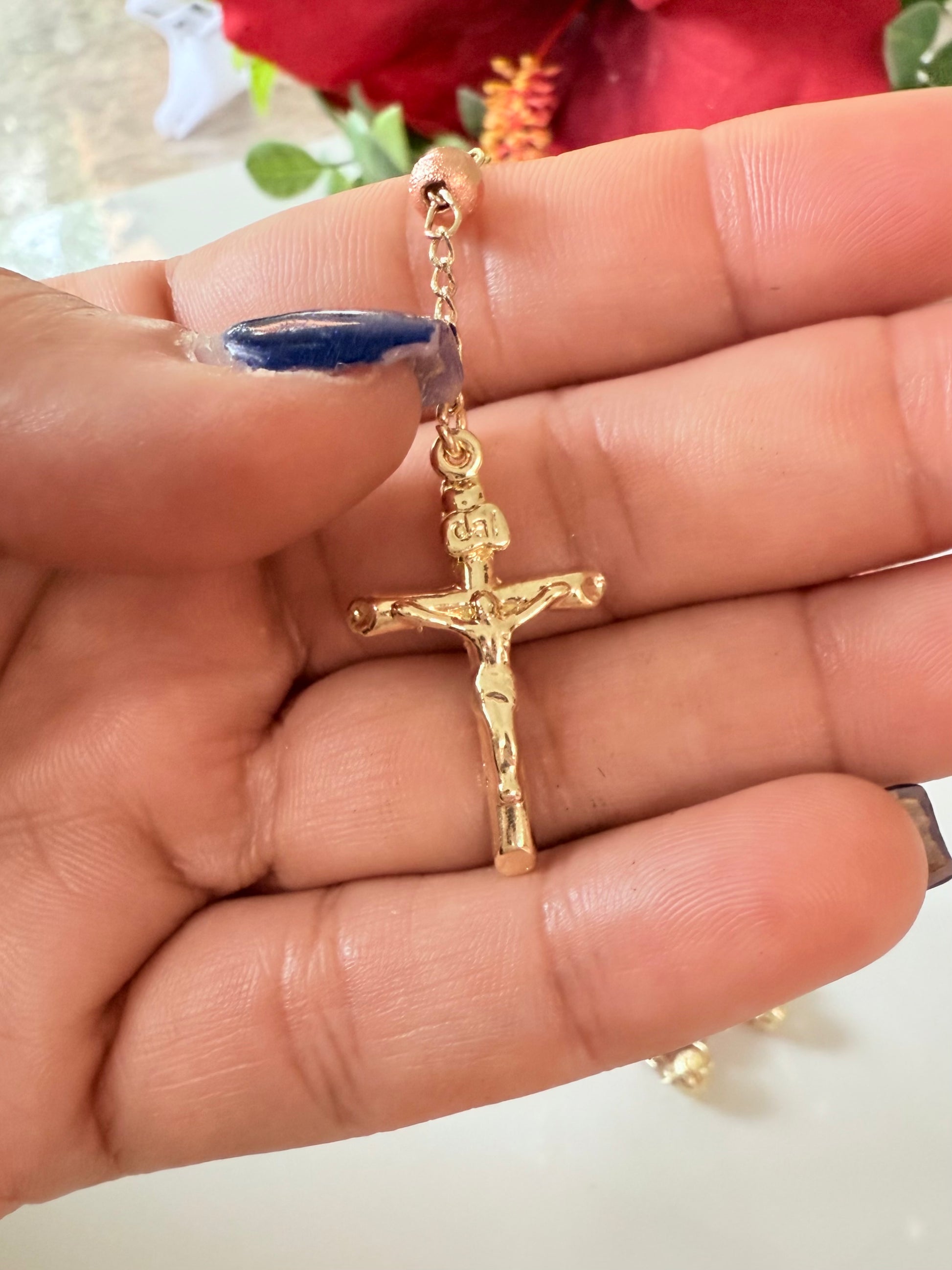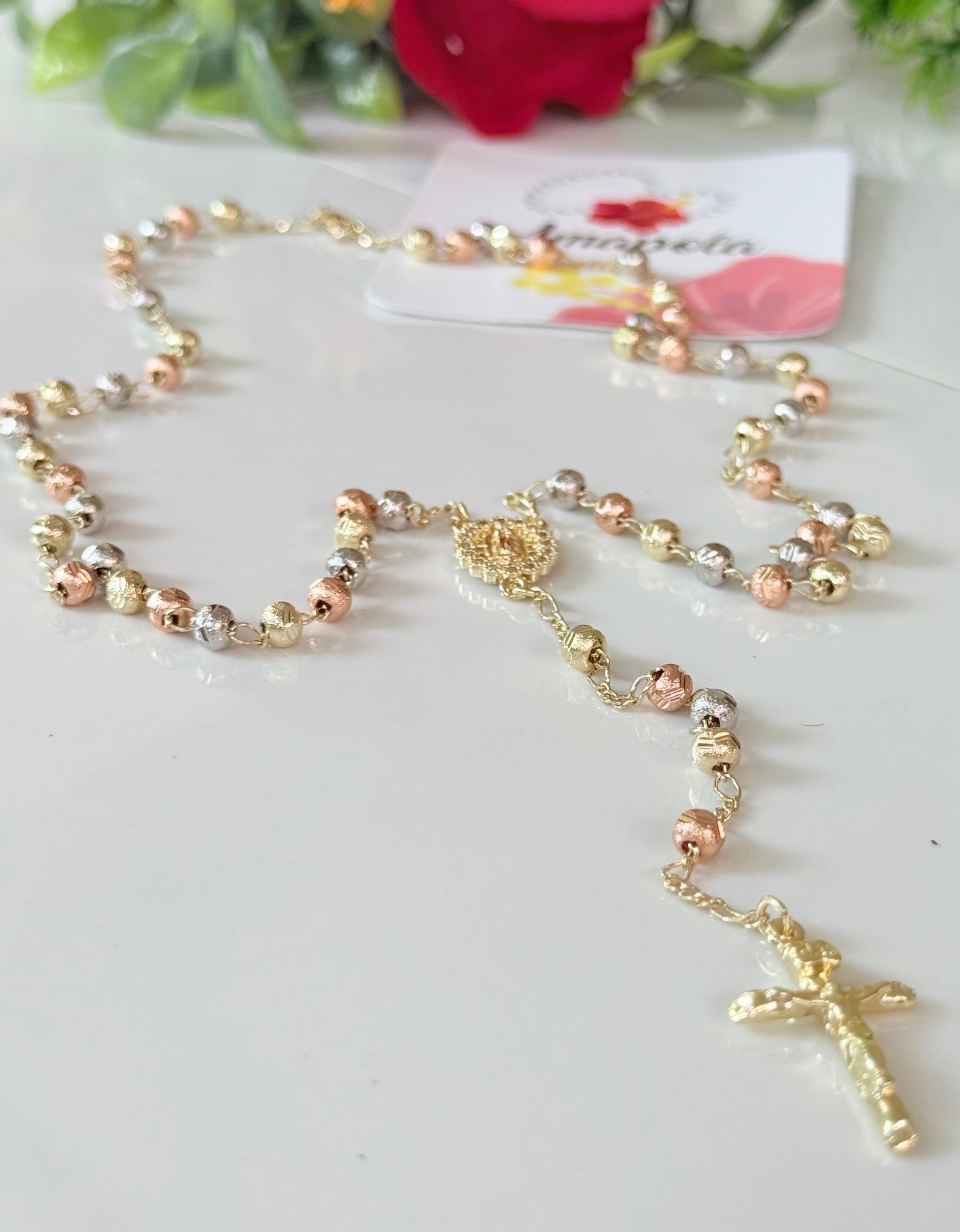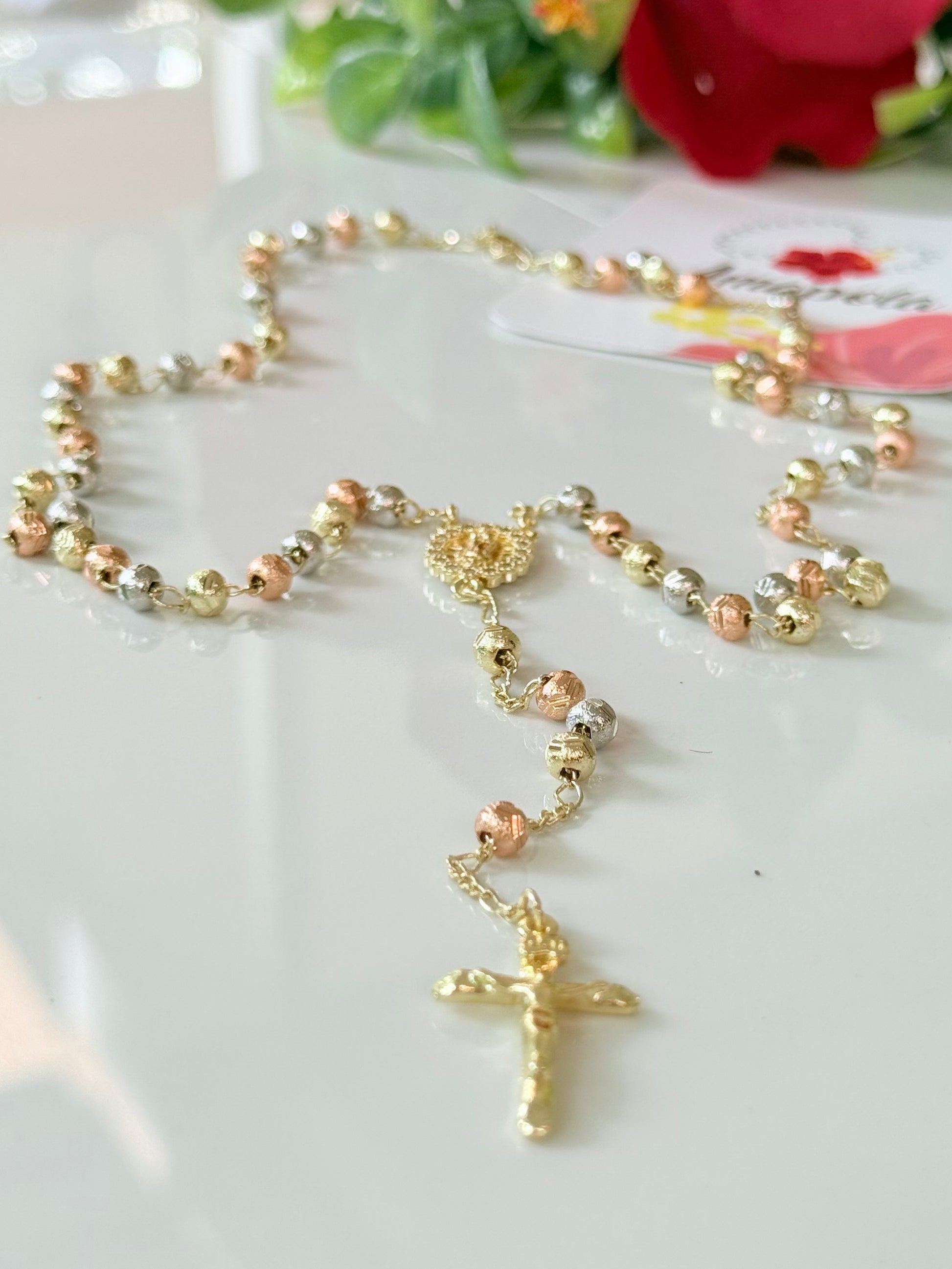 Hermoso Rosario en baño de oro en tres tonos. Rosario mide 27” Rosario con cierre. Estilo facetado disponible.