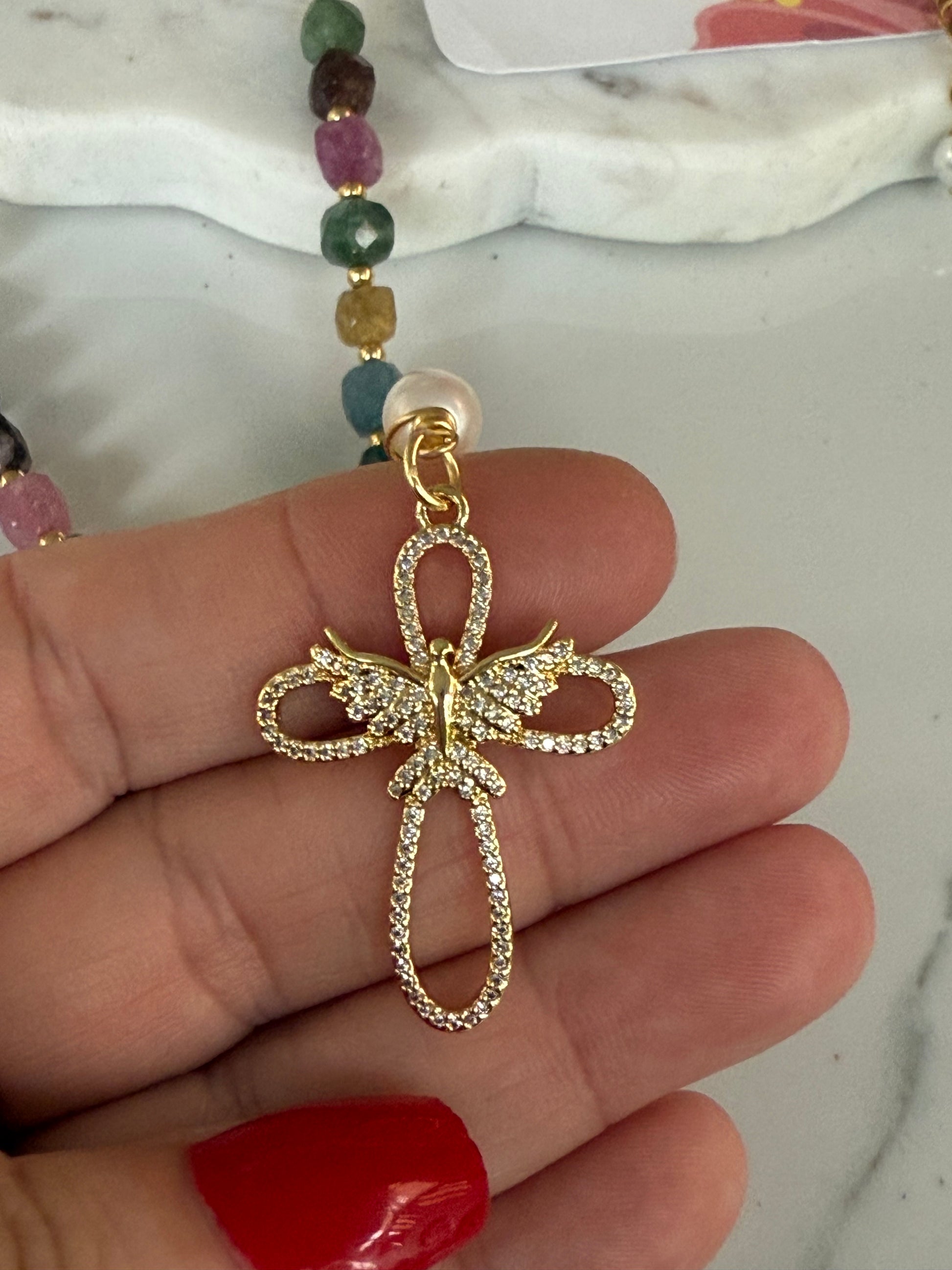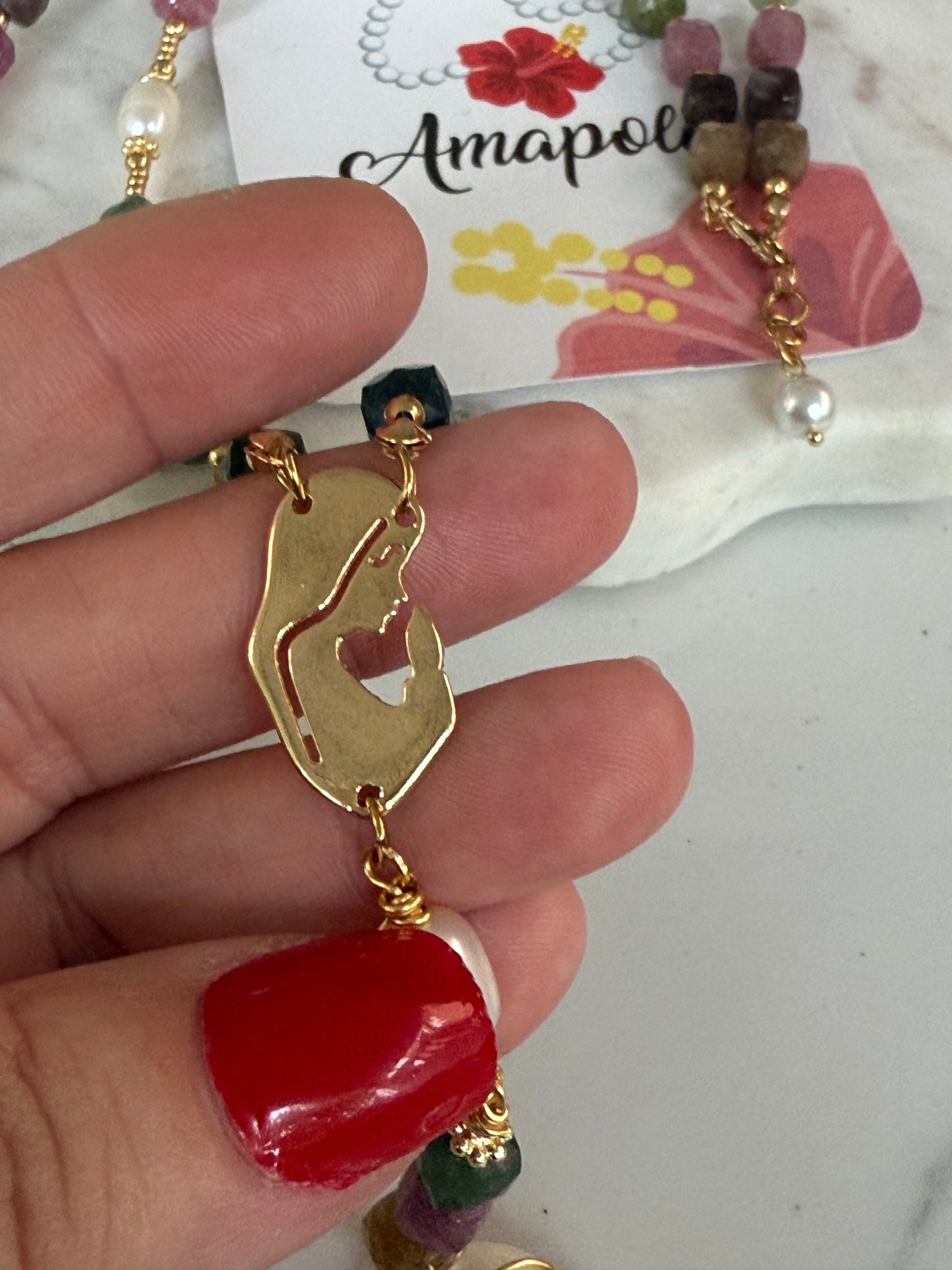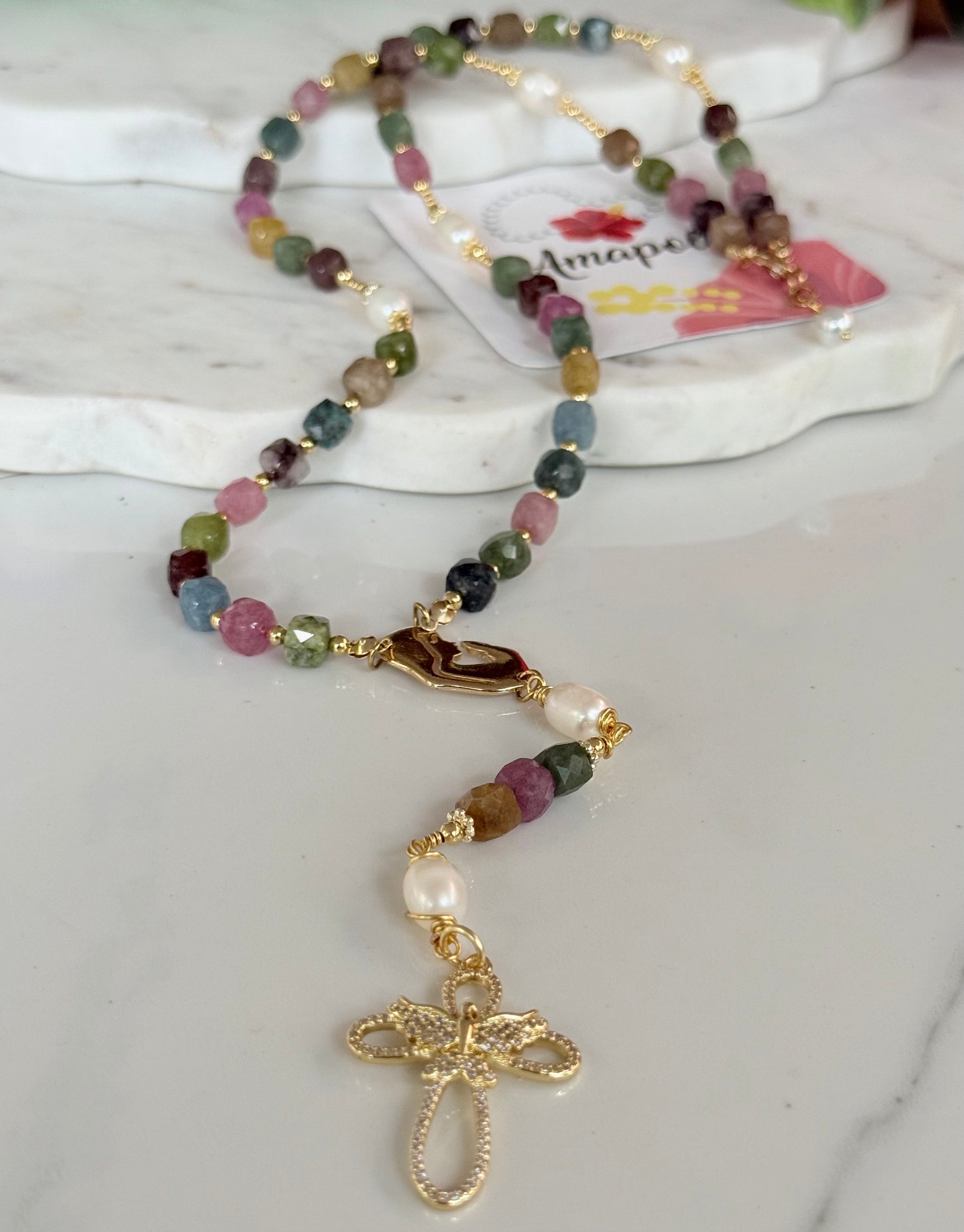 Hermoso Rosario hecho a mano en ágatas cúbicas y potato pearls. Con detalles en baño de oro. Centro de María en posición de oración y cruz en zirconias. Rosario es largo mide 36” aproximadamente