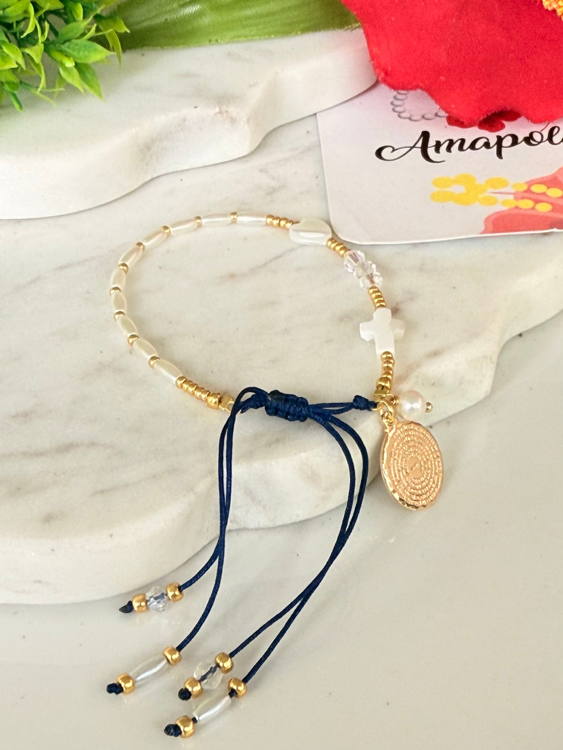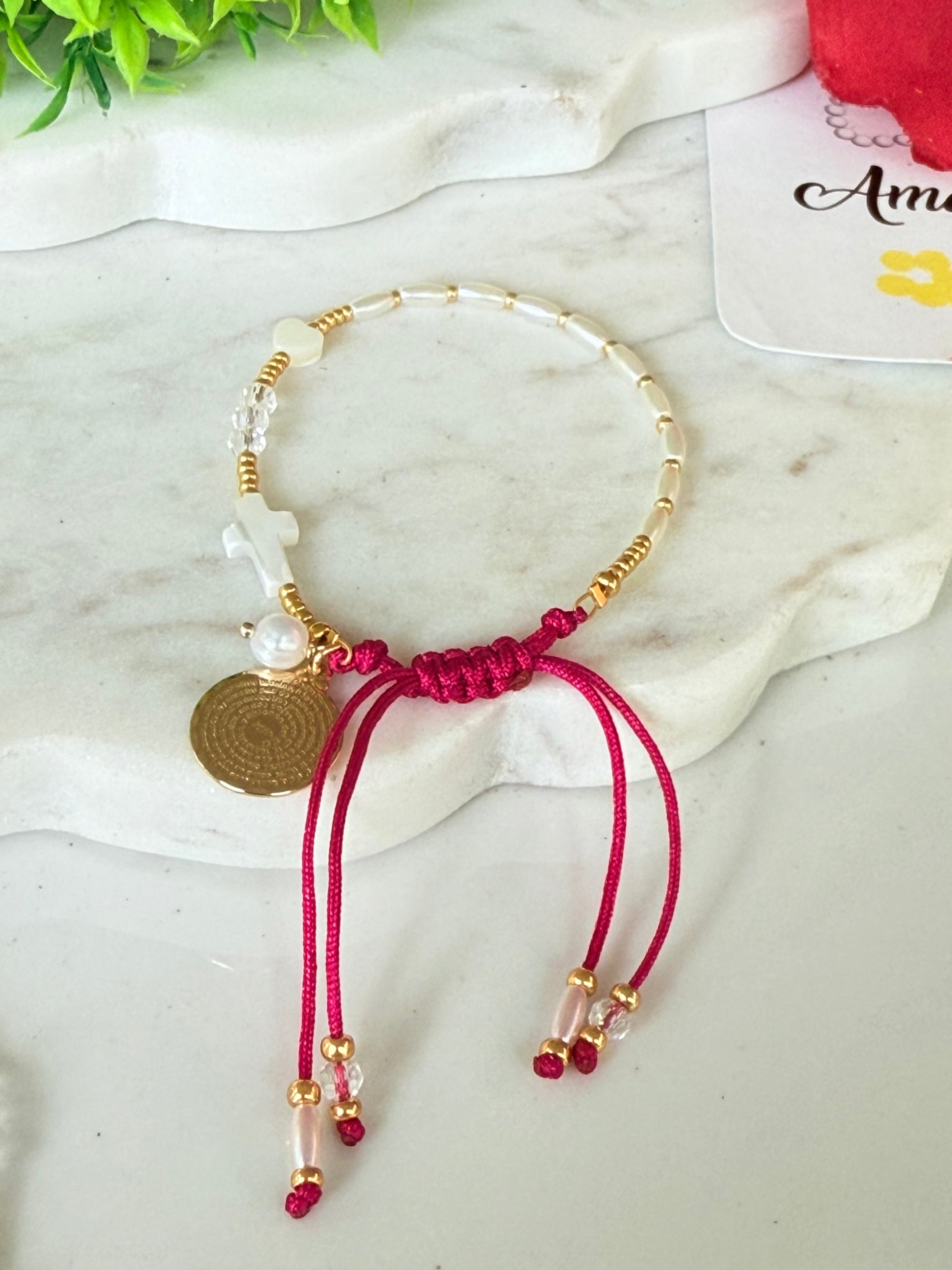 Hermosa y delicada pulsera hecha a mano en canutillos perlados, cristales y corazón y cruz en nácar. Pulsera lleva como colgante Medalla con el padrenuestro y Perla alambrada. Es ajustable y de igual manera tiene cristales en la punta de los hilos.