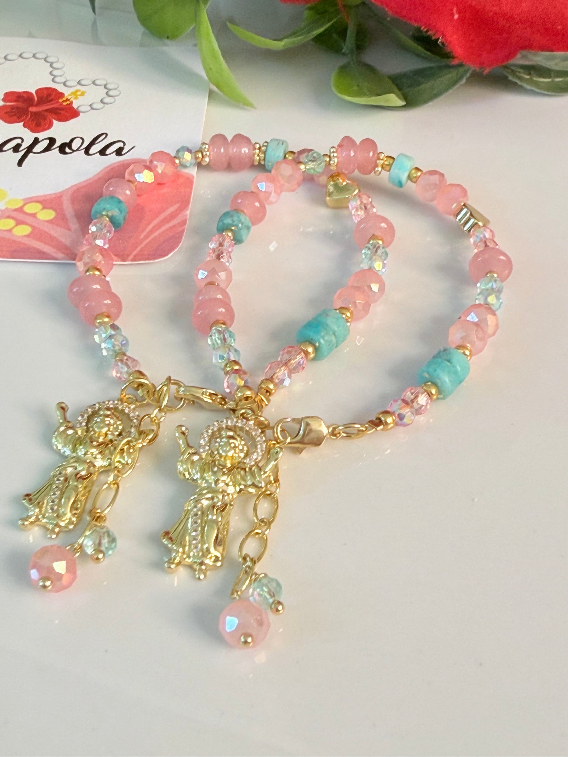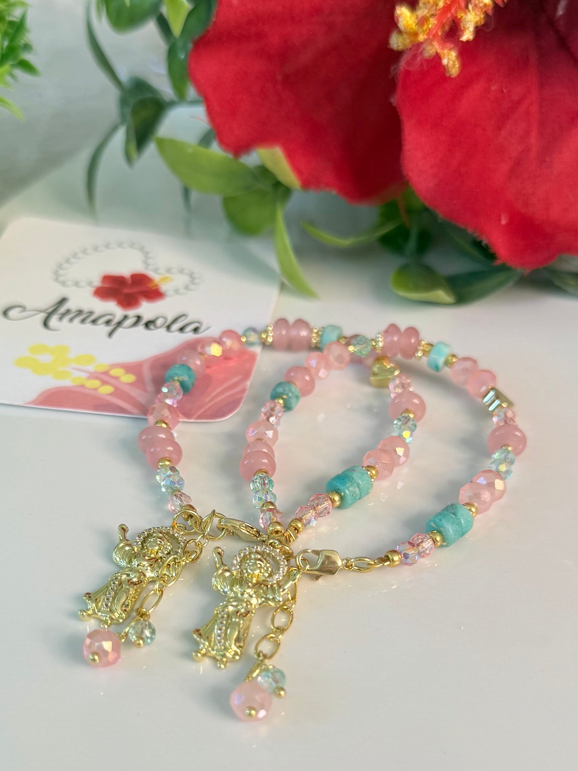 Hermosa pulsera hecha a mano en cristales, piedras semipreciosas y detalles en baño de oro. Con dije del divino niño. Pulsera mide 6.5” con extensor de 1”.