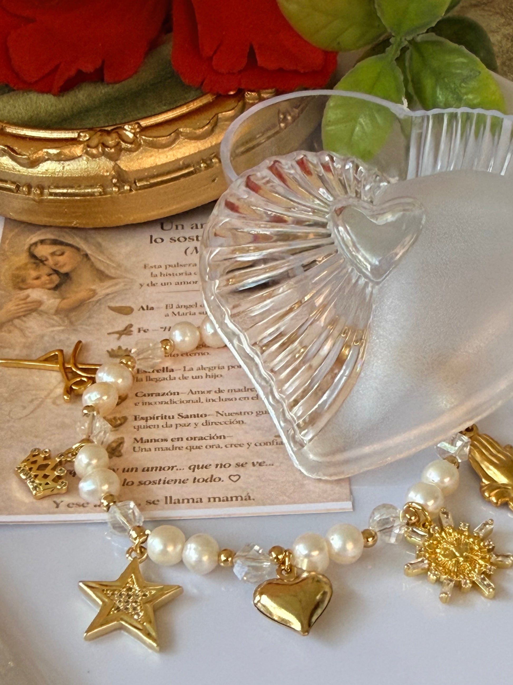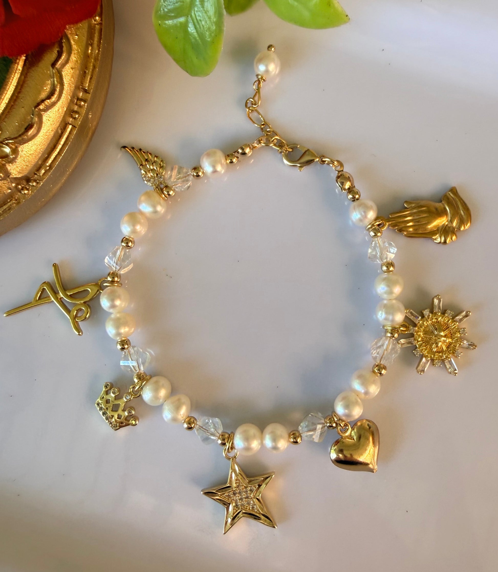 Hermosa y significativa pulsera hecha a mano con mucho esmero, amor y dedicación para todas las madres que nos identificamos. Hecha con perlas de agua dulce y cristales transparentes facetados. Cada dije tiene un significado simbólico. Son en baño de oro al igual que sus detalles. Pulsera mide 6.5” con extensor de 1”.