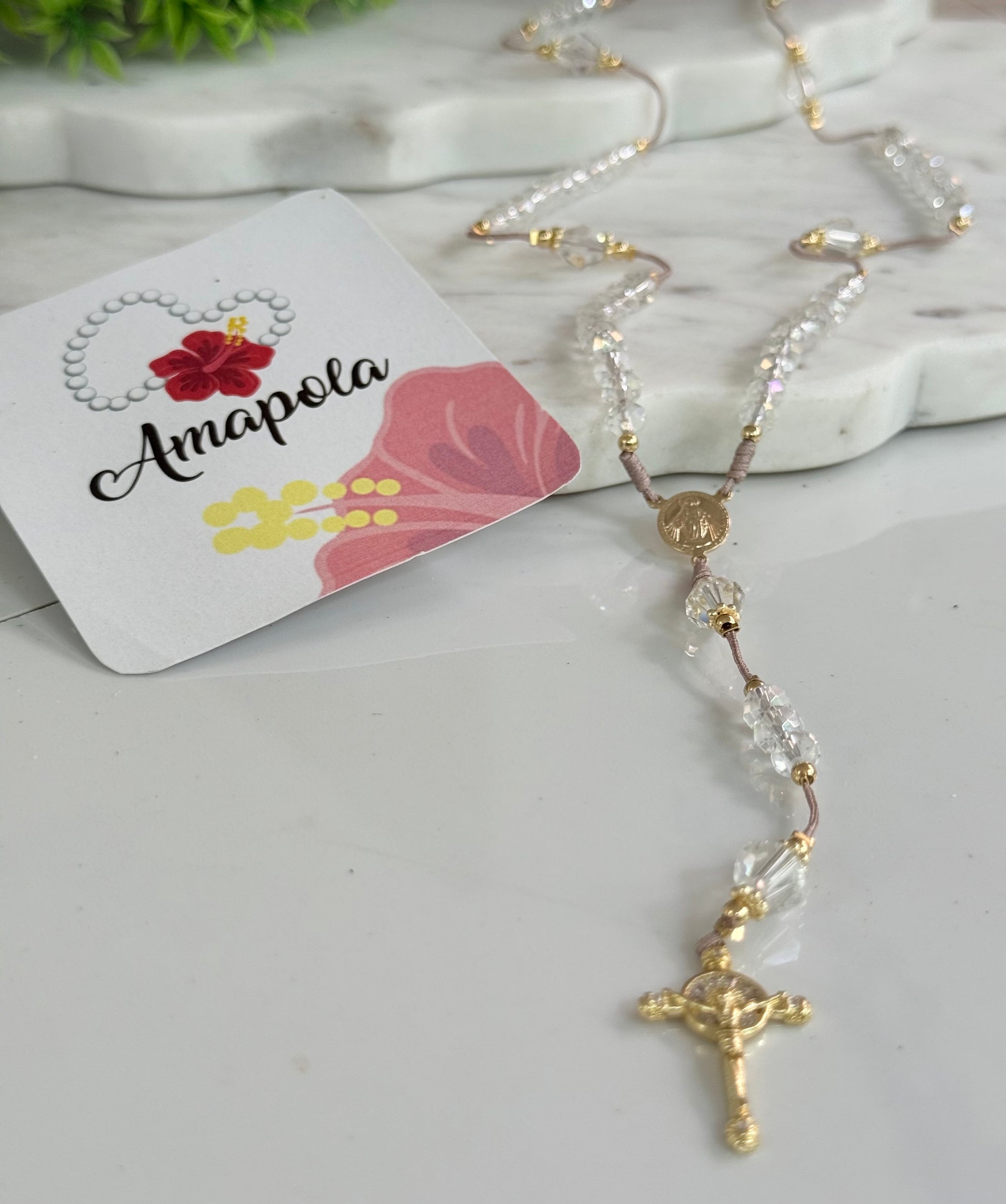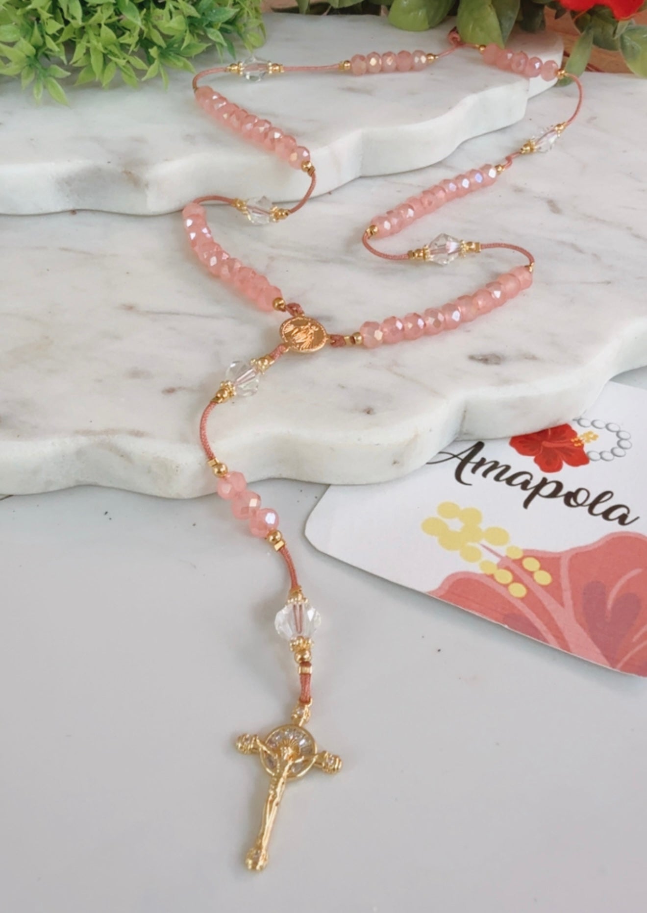 Hermoso Rosario en hilo color guayaba y color gri hecho a mano en cristales rosados y cristales transparente, con detalles en baño de oro. Rosario es en hilo lo que hace que sea ajustable. Dos estilos a escoger.