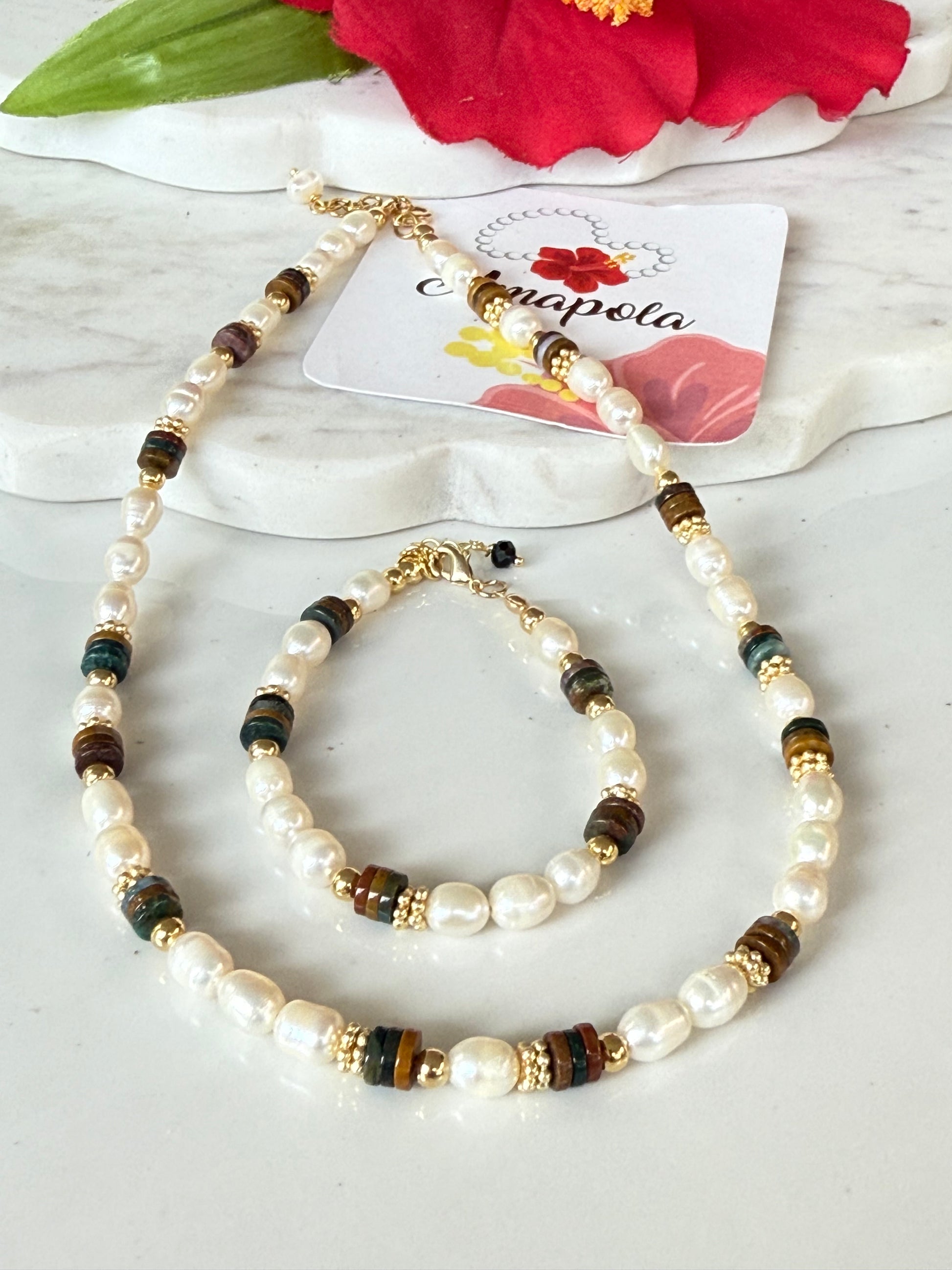 Hermoso conjunto hecho a mano en perlas y discos de ágatas semipreciosas en tonos de otoño. Collar mide 16” con extensor y pulsera 6.5” con extensor. Conjunto incluye collar y pulsera