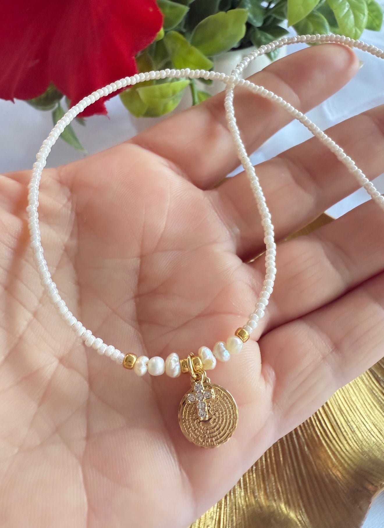 Hermoso y delicado collar corto hecho a mano en mostacilla blanca perlada y perlas. Detalles en baño de oro y padrenuestro pequeño con cruz en zirconias. Estrella en baño de oro con palabra de en el centro. Collar mide 14” con extensor de 1”.